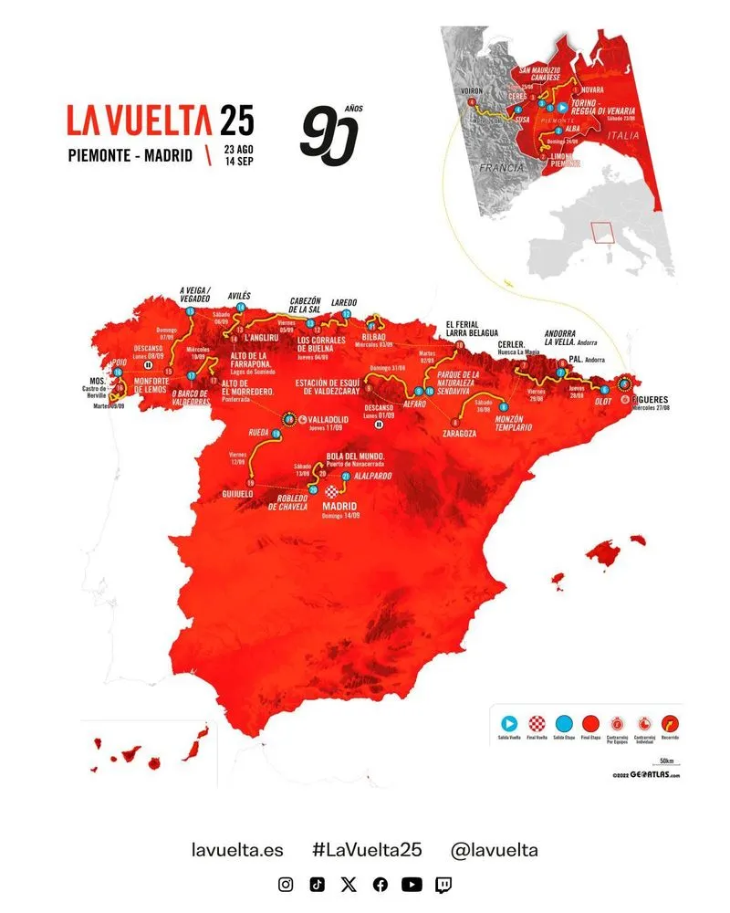 Manca sempre meno alla Grande Partenza dell'edizione 2025 de «La Vuelta a España», la più importante corsa ciclistica spagnola, prevista per sabato 23 agosto 2025.